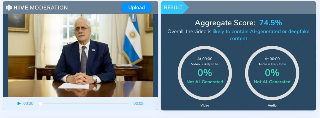 Un análisis del video con la herramienta Hive Moderation —que permite detectar si un contenido fue creado con IA— indicó un 75% de probabilidad de que la secuencia haya sido generada con esa tecnología.