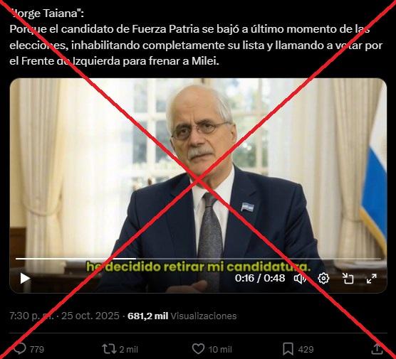 Para las elecciones legislativas argentinas del 26 de octubre de 2025, Jorge Taiana encabeza la lista bonaerense de candidatos a diputado nacional por el partido opositor Fuerza Patria. Sin embargo, un supuesto video en el que anuncia que retira su postulación comenzó a circular un día antes de los comicios y supera los 2.500 compartidos en redes sociales. En realidad, la secuencia fue generada con inteligencia artificial (IA) y la Cámara Nacional Electoral confirmó a Reverso que la oferta electoral sigue vigente.