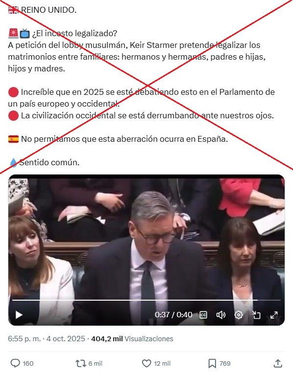 El 22 de septiembre de 2025, el Servicio Nacional de Salud (NHS) del Reino Unido publicó un artículo sobre las ventajas y desventajas del matrimonio entre primos hermanos, una unión legalizada en el país. Desde esa fecha, se ha compartido en redes sociales más de 6.200 veces un video que supuestamente muestra al primer ministro, Keir Starmer, legalizando matrimonios entre hermanos y entre padres e hijos, influenciado por un supuesto “lobby musulmán”. Sin embargo, esto es falso, el video muestra el rechazo, en marzo, a una propuesta para prohibir las uniones entre primos hermanos.