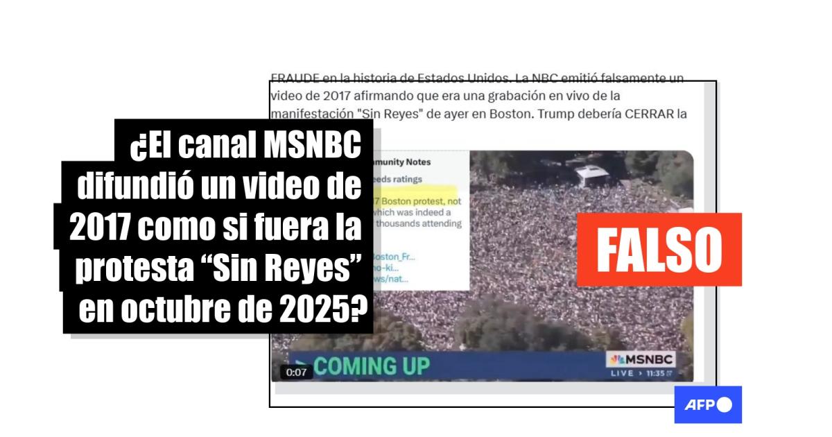 El 18 de octubre de 2025, miles de personas protestaron en el Día “Sin Reyes” en Estados Unidos contra las políticas del presidente Donald Trump. En ese contexto, usuarios en redes sociales han compartido más de 200 veces capturas de pantalla de un video aéreo y de una nota de la comunidad en X, junto con la afirmación de que la cadena de televisión MSNBC emitió falsamente un video de 2017 alegando que eran imágenes en directo de mitin “Sin Reyes” en Boston. En realidad, el video sí es actual y muestra a la multitud en la capital de Massachusetts.
