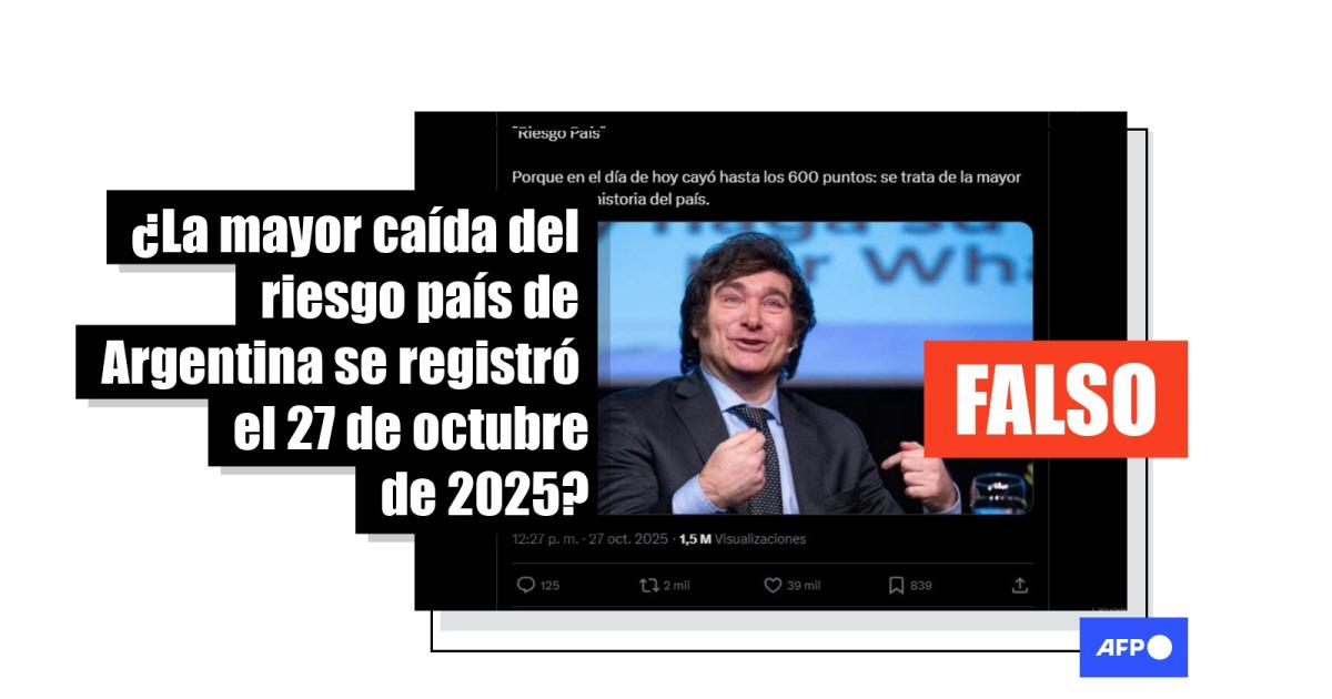 El riesgo país de Argentina bajó a 652 puntos tras la victoria del partido oficialista en las elecciones legislativas del 26 de octubre de 2025. Sin embargo, no se trata de “la mayor caída de la historia”, como aseguran más de 3.000 usuarios en redes sociales. Economistas confirmaron a la AFP que la mayor disminución del indicador ocurrió en 2005 y llegó a su piso histórico en 2007, durante el gobierno de Néstor Kirchner (2003-2007).