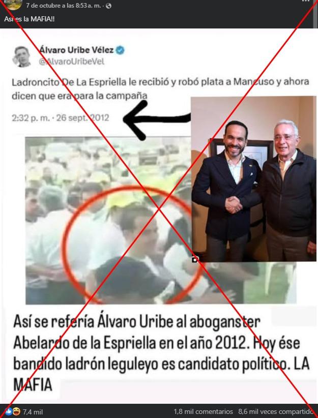 “Ladroncito De La Espriella le recibió y robó plata a Mancuso y ahora dicen que era para la campaña”, dice el mensaje escrito en la cuenta en X de Uribe. La captura de pantalla, compartida en Facebook (1, 2), TikTok y Threads, se acompaña con fotos del abogado Abelardo de la Espriella.
