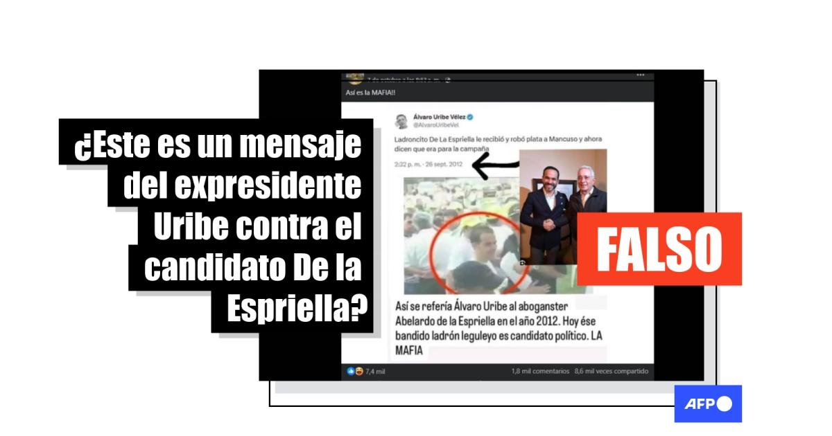 El abogado colombiano Abelardo de la Espriella, seguidor del expresidente Álvaro Uribe (2002-2010), es precandidato a las elecciones presidenciales de 2026. En ese contexto, en octubre de 2025, se ha compartido más de 9.000 veces en redes sociales una captura de pantalla de un mensaje de Uribe en X, en el que supuestamente le llamó “ladroncito” al aspirante. Sin embargo, el mensaje iba dirigido al excongresista Miguel de la Espriella, con quien el exmandatario tuvo una disputa en 2012.