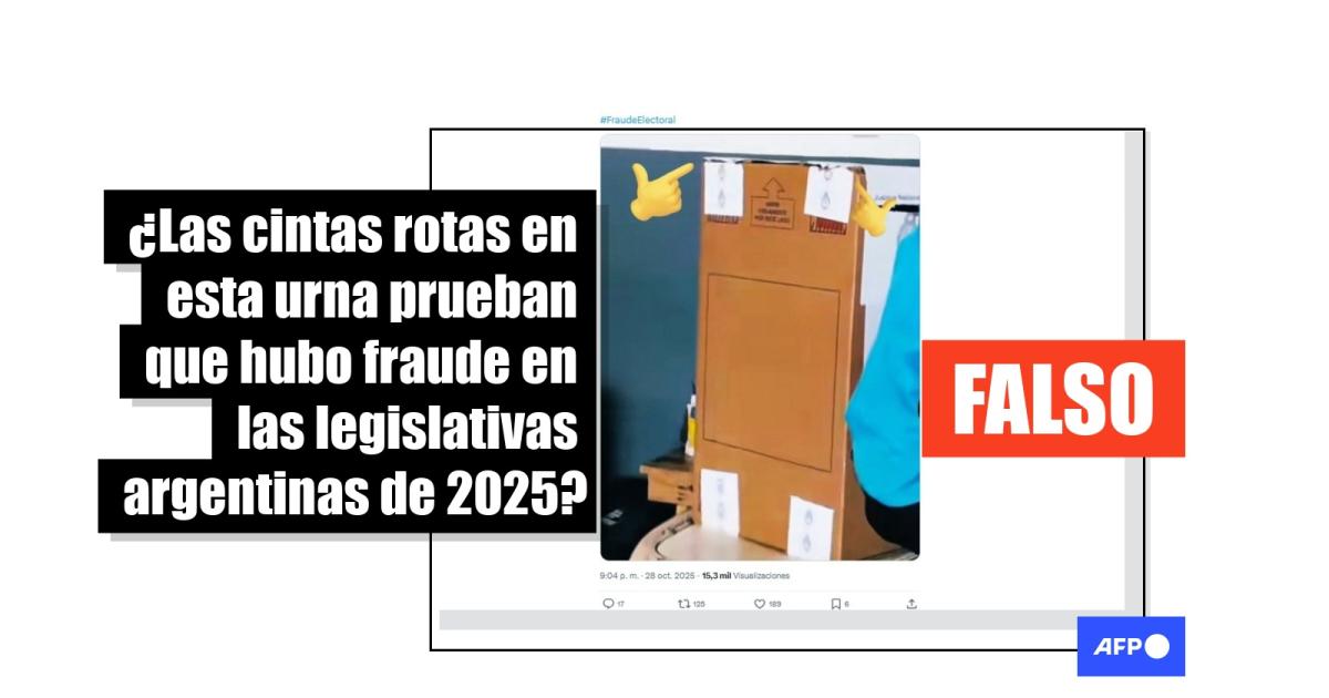 El partido del presidente argentino, Javier Milei, se impuso a nivel nacional en las elecciones legislativas de medio término del 26 de octubre de 2025. Desde entonces, circulan en redes sociales imágenes de una urna con cintas rotas como prueba de un supuesto fraude electoral. El contenido fue compartido más de 1.300 veces. Pero la cinta que garantiza la seguridad de la urna es una más ancha y se coloca por encima de las que señalan los usuarios, algo que también se observa en las imágenes, explicó a la AFP la Cámara Nacional Electoral.