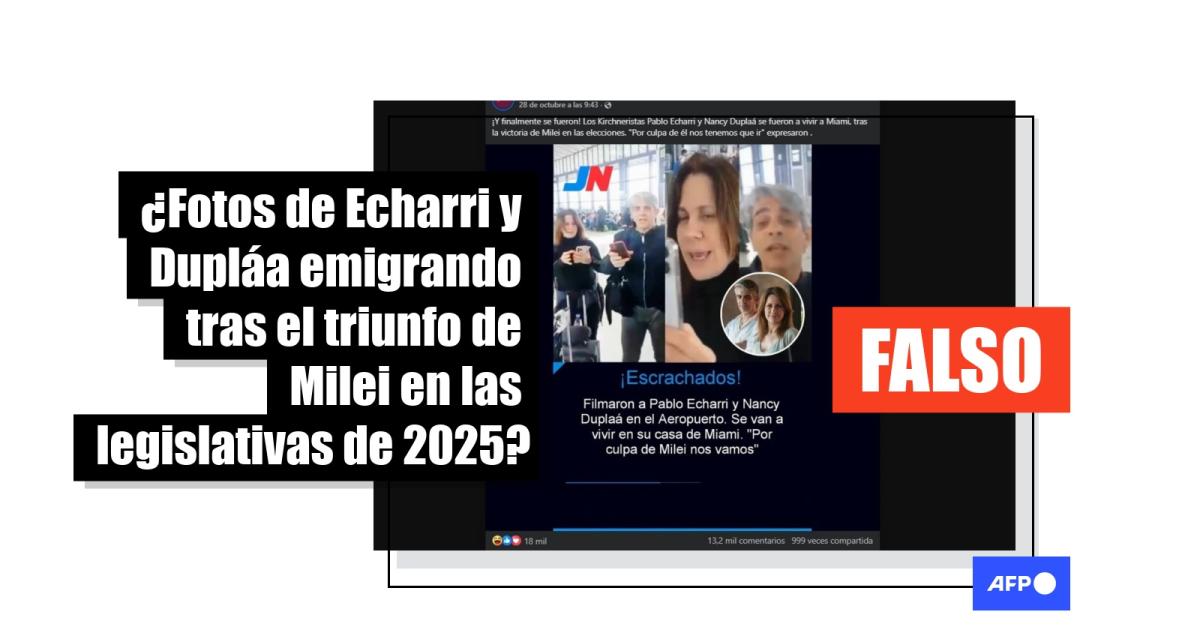 Los actores argentinos Pablo Echarri y Nancy Dupláa se han manifestado en contra del gobierno del presidente Javier Milei. Tras el triunfo del oficialismo en las legislativas del 26 de octubre de 2025, comenzaron a circular en redes sociales fotos de la pareja en el aeropuerto, supuestamente antes de mudarse a Miami en disconformidad con el resultado electoral. Sin embargo, las imágenes —compartidas más de 1.200 veces— fueron tomadas de un video de un altercado ocurrido en 2023. Dupláa negó el 31 de octubre a la AFP tener intención de irse del país.