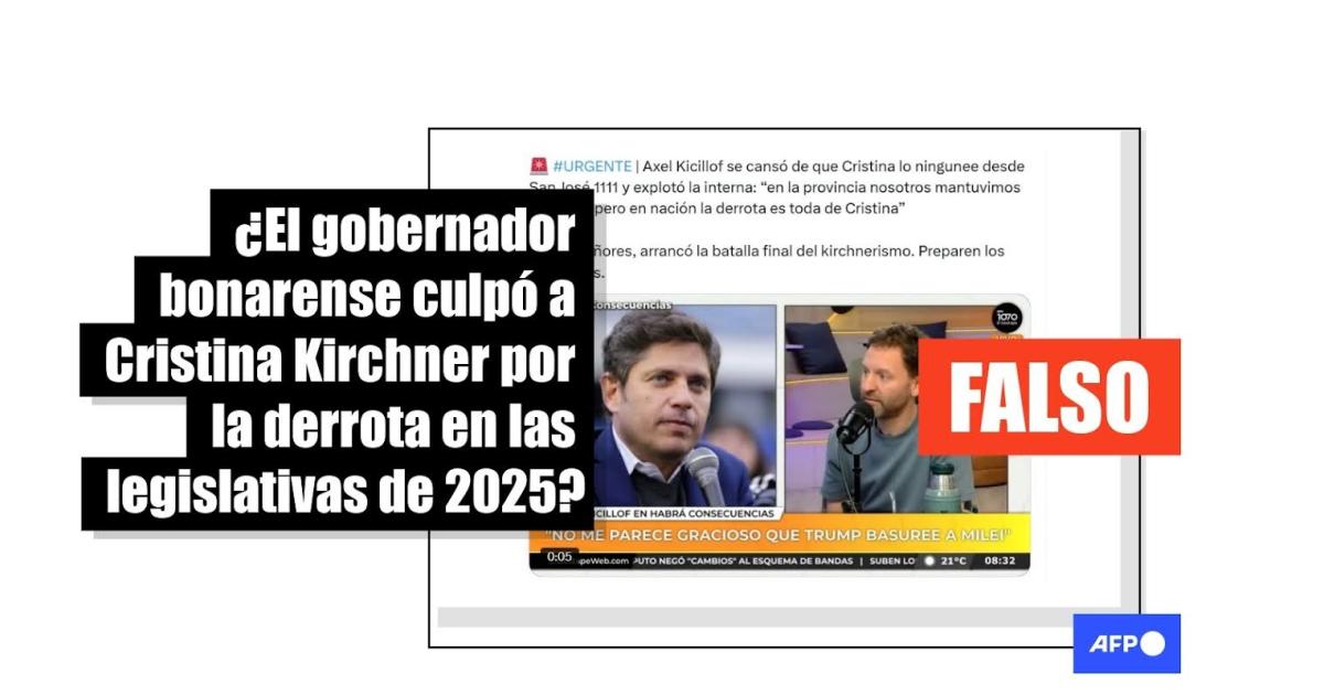Axel Kicillof, gobernador de la provincia de Buenos Aires, emergió de las elecciones bonaerenses de septiembre como un posible líder de la oposición frente a la expresidenta Cristina Kirchner (2007-2015), inhabilitada por corrupción. Así, luego de que el partido oficialista La Libertad Avanza se impusiera a nivel nacional en las legislativas del 26 de octubre de 2025, un supuesto video de Kicillof responsabilizando a la exmandataria de la derrota se compartió miles de veces en redes sociales. Sin embargo, el audio fue generado con inteligencia artificial.