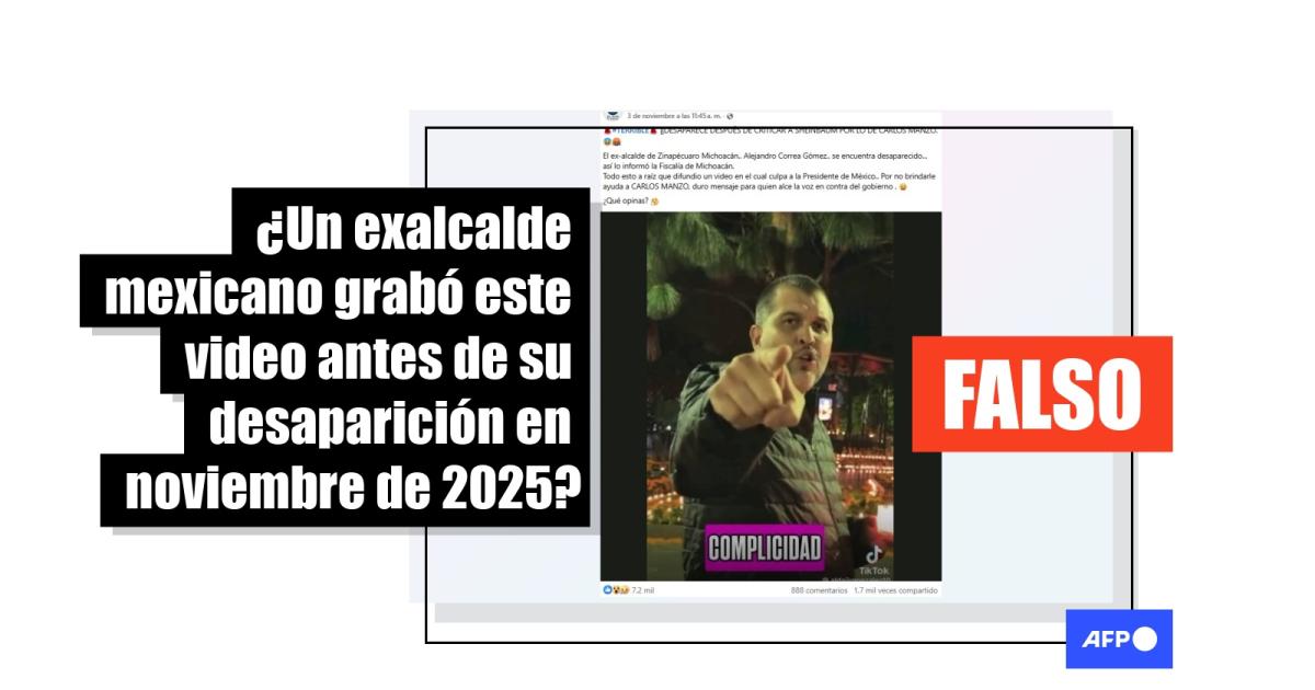El exalcalde del municipio mexicano Zinapécuaro, Alejandro Correa, fue reportado como desaparecido el 3 de noviembre de 2025. Desde entonces, en redes sociales se ha compartido más de 40.000 veces la afirmación de que esto ocurrió después de criticar al gobierno en un video por el asesinato del alcalde de Uruapan, Carlos Manzo. Pero la persona de la secuencia difundida en los mensajes no es él, sino el activista René Valencia. Después de tres días de búsqueda, Correa fue encontrado con vida.