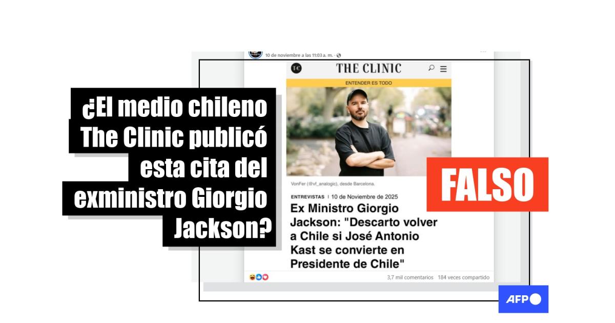 El político chileno Giorgio Jackson, exministro del gobierno de Gabriel Boric, se radicó en España en 2024 tras renunciar al cargo por un escándalo de corrupción. Desde el 9 de noviembre de 2025, usuarios en redes sociales han compartido cerca de 1.000 veces una supuesta imagen de una entrevista atribuida al medio The Clinic que dice que Jackson descarta volver al país si el opositor José Antonio Kast gana las elecciones presidenciales. Sin embargo, la imagen, que presenta inconsistencias gráficas, fue desmentida por el medio, y no hay registro de la supuesta declaración.