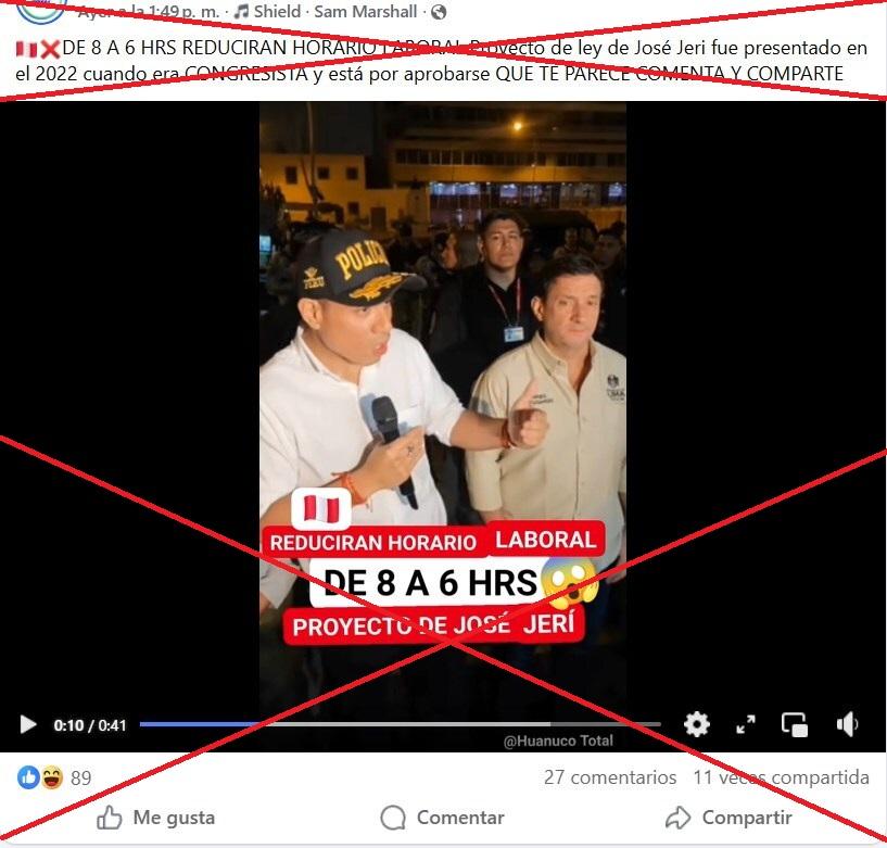 Tras la destitución de Dina Boluarte, el 10 de octubre de 2025, el jefe del Congreso peruano, José Jerí, asumió la Presidencia interina. Días después, circuló más de 18.000 veces en redes sociales que el Parlamento aprobó la reducción del horario laboral, de 8 a 6 horas, por iniciativa del nuevo mandatario. Pero esto es falso. Desde su asunción, no se ha presentado ninguna iniciativa de esa naturaleza ante el Congreso.