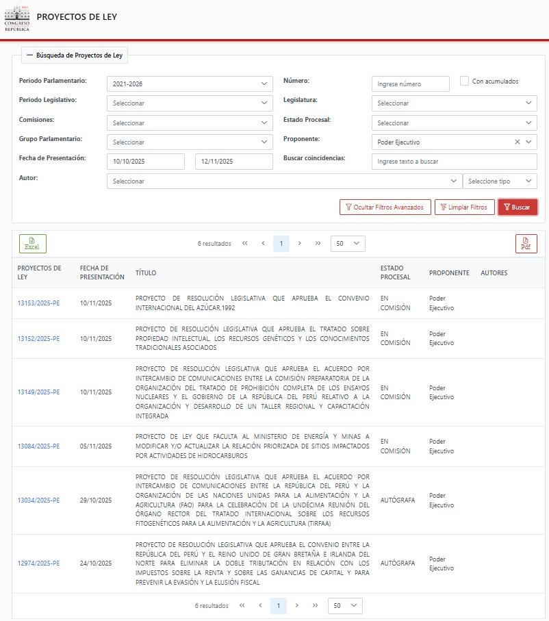 Una búsqueda en el portal web del Congreso de Perú, que almacena todas las iniciativas legales de todos los poderes estatales, arrojó que, desde el 10 de octubre, el Poder Ejecutivo ha presentado seis proyectos de ley, pero ninguno sobre la temática laboral o relacionado con dicha ley.