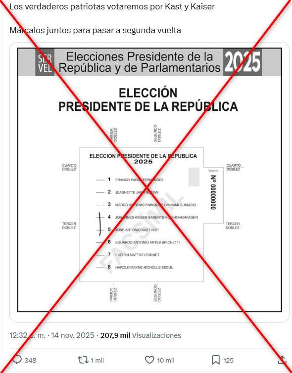 El Servicio Electoral chileno publicó a fines de octubre de 2025 la papeleta de votación con los nombres de los presidenciables a los comicios del 16 de noviembre. Tres días antes, la afirmación errónea de que se puede votar por más de un candidato se compartió más de 4.500 veces en redes sociales. La ley estipula que las cédulas en las que aparezcan marcadas más de una preferencia serán consideradas “nulas”.