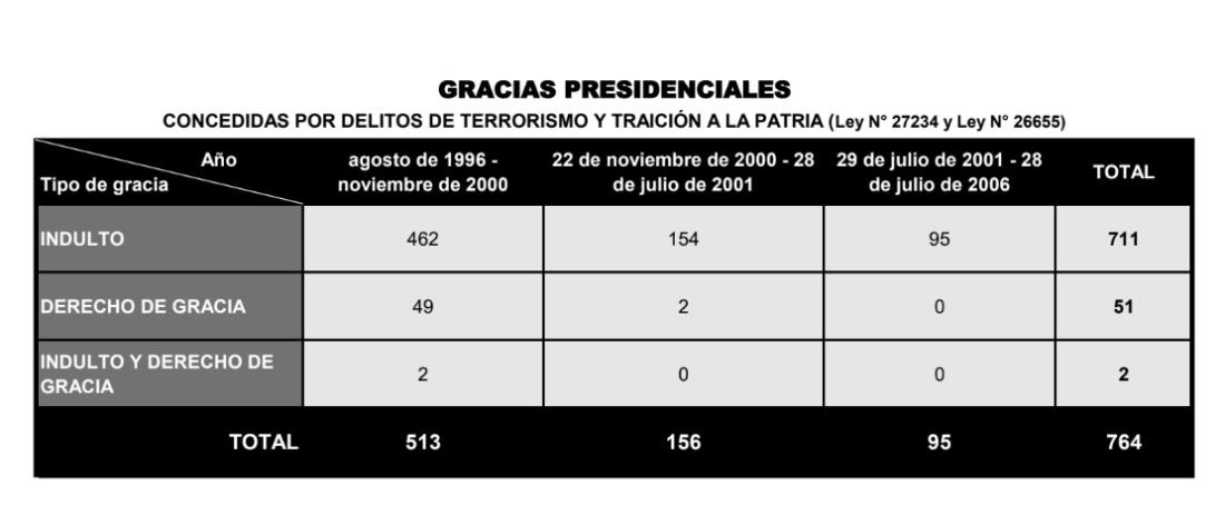 La cartera también indicó que desde agosto de 1996 hasta noviembre de 2000 —que abarca el periodo del exmandatario Alberto Fujimori (1990-2000) — fueron liberadas 513 personas beneficiadas con estas leyes.