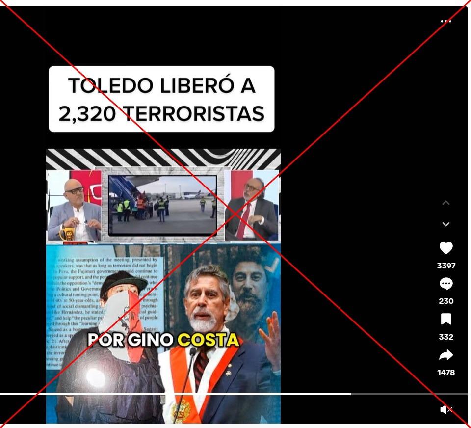 “Toledo liberó a 2.320 terroristas”, se lee en el cintillo de un video compartido en Facebook, Instagram y TikTok. En la secuencia se oye hacer la afirmación al periodista peruano Umberto Jara durante una entrevista en el programa Beto a Saber.