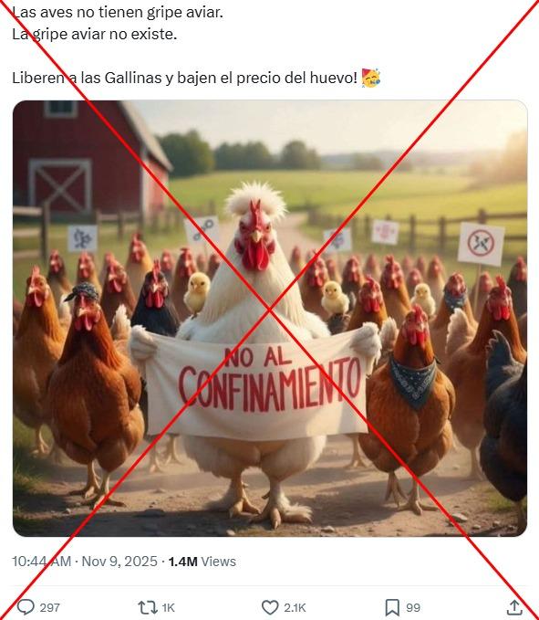 El Ministerio de Agricultura español decretó el confinamiento de todas las aves de corral criadas al aire libre debido a la gripe aviar el 13 de noviembre de 2025. El aumento del riesgo de expansión de la enfermedad entre los animales coincidió ese mes con la difusión de mensajes en redes sociales, compartidos más de 14.600 veces, que niegan la existencia de esa gripe. Pero hay evidencias y consenso científico sobre la realidad del virus, confirman los documentos y expertos consultados por AFP Factual.