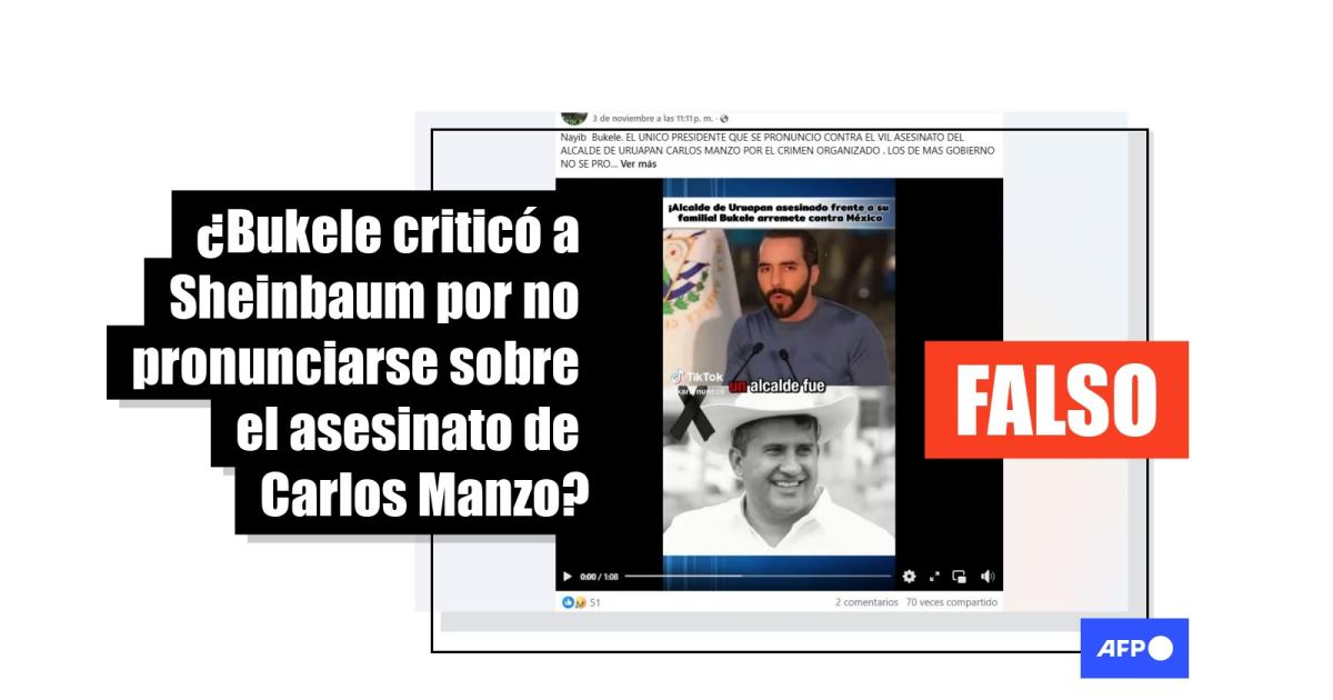 El presidente salvadoreño, Nayib Bukele, ha cuestionado las estrategias de seguridad de otros países de Latinoamérica. Pero un video en el que supuestamente lamenta que la presidenta mexicana, Claudia Sheinbaum, no dijera ni “una sola palabra” sobre el asesinato del alcalde Carlos Manzo, es falso. La secuencia, compartida decenas de veces en redes sociales en noviembre de 2025, corresponde a un discurso de 2023 cuyo audio fue alterado con inteligencia artificial (IA).