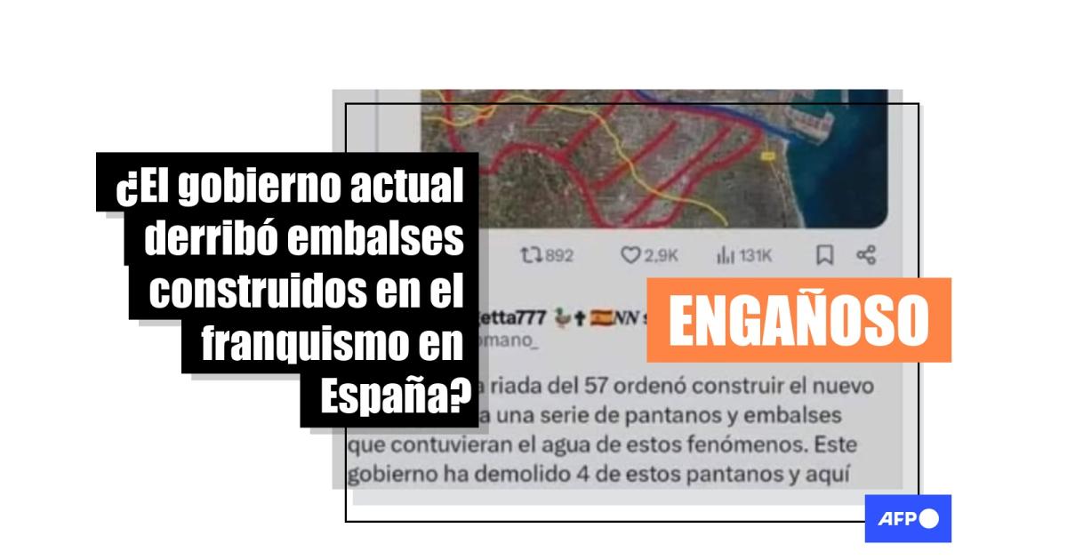 Un año después de la dana en Valencia y en el 50º aniversario de la muerte del dictador español Francisco Franco (1939-1975), un mensaje en redes sociales compara el régimen pasado, que, afirma, desarrolló infraestructuras “que contuvieran el agua de estos fenómenos”, con el gobierno actual de España, del que asegura que demolió “4 de estos pantanos”. La afirmación se difundió más de 6.000 veces en 2024 y 2025. Pero muchas de las presas construidas en el franquismo procedían de etapas anteriores y el Gobierno actual no derribó pantanos en Valencia, aseveró su gabinete y confirmó AFP Factual.