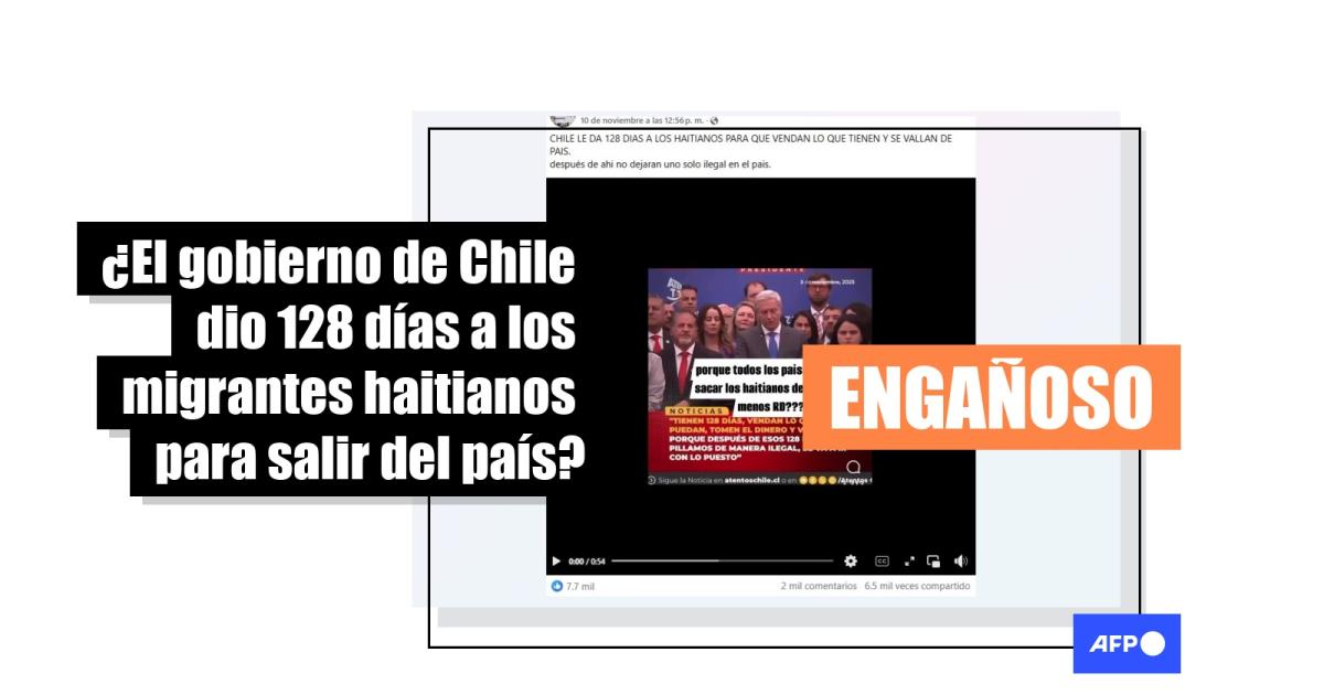 La campaña a las elecciones presidenciales en Chile en 2025 ha girado en torno a la migración irregular y la inseguridad. En ese contexto, desde noviembre, en redes sociales se ha difundido más de 9.000 veces la afirmación de que ese país dio 128 días a los migrantes haitianos para salir del territorio. Pero se basa en una propuesta de un candidato presidencial, que no mencionó específicamente a los haitianos. No es una decisión del actual gobierno, confirmó a la AFP el Servicio Nacional de Migraciones.