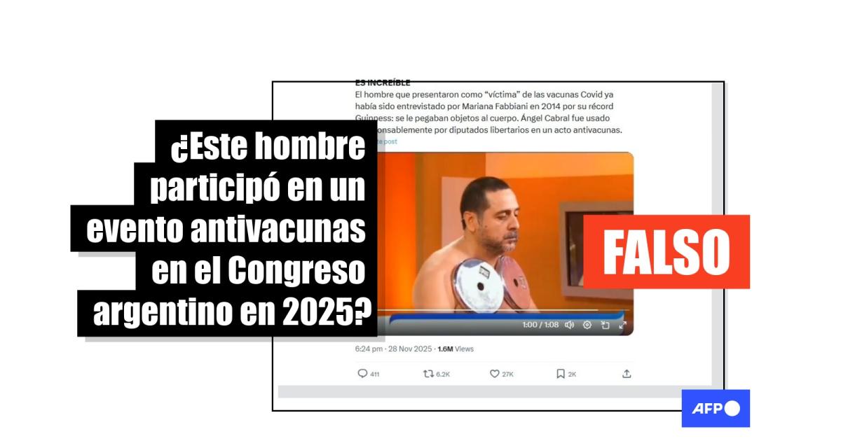 Un acto antivacunas en el Congreso argentino reavivó el 27 de noviembre de 2025 la desinformación que asegura que los inmunizantes contra el covid-19 provocan “magnetización”, luego de que un hombre intentó demostrarlo al pegarse un imán al cuerpo. Desde entonces, 6.000 usuarios en redes sociales aseguran que el participante ya había mostrado esta “habilidad” en televisión en 2014 por un récord Guinness, y exhiben un video de una entrevista como prueba. Pero confunden a otra persona: Ángel Cabral, ganador del premio en 2017 por el mayor peso levantado con pesas equilibradas sobre el pecho.