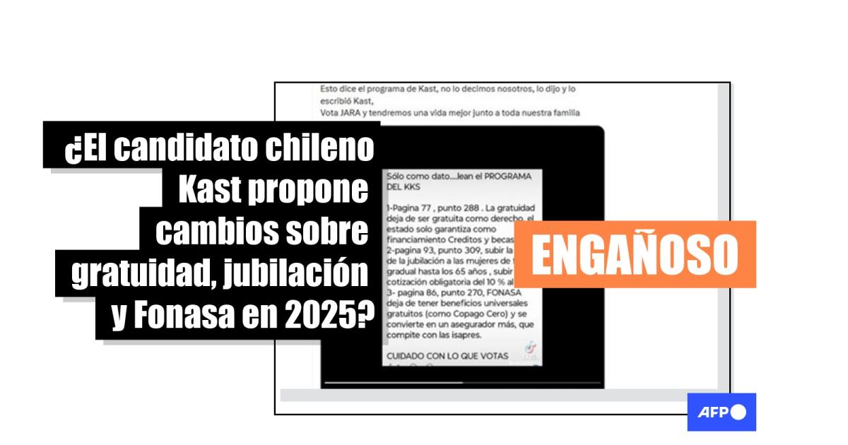 En su tercer intento por llegar a la Presidencia de Chile, el opositor José Antonio Kast competirá en la segunda vuelta electoral contra la oficialista Jeannette Jara el 14 de diciembre de 2025. En este contexto, desde fines de noviembre circula una imagen que le atribuye tres propuestas: eliminar la gratuidad universitaria, aumentar la edad de jubilación y modificar el Fondo Nacional de Salud (Fonasa). Sin embargo, el contenido compartido más de 3.500 veces no se encuentra en su programa de 2025; son propuestas hechas para los comicios de 2021.