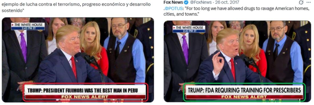 Los mensajes incluyen una imagen que muestra a Trump dando un discurso, junto con un rótulo de Fox News que reza: “Trump: President Fujimori was the best man in Peru”, como si fuese una transmisión del canal estadounidense.