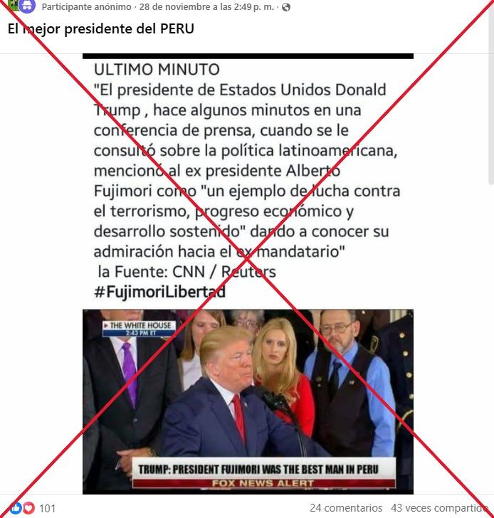 “El presidente de Estados Unidos Donald Trump, hace algunos minutos en una conferencia de prensa, cuando se le consultó sobre la política latinoamericana, mencionó al ex presidente Alberto Fujimori como ‘un ejemplo de lucha contra el terrorismo, progreso económico y desarrollo sostenido’ dando a conocer su admiración hacia el ex mandatario”, se lee en publicaciones en X, Facebook e Instagram.