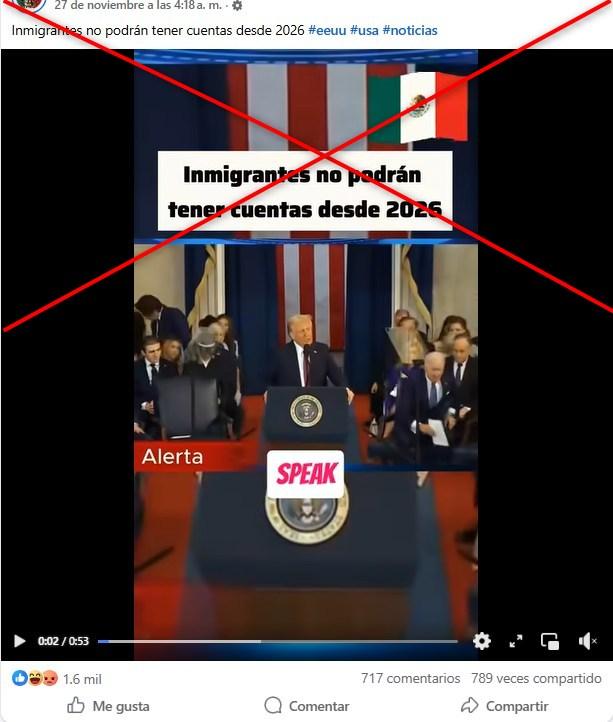 “Inmigrantes no podrán tener cuentas desde 2026”, dicen publicaciones en Facebook, Instagram y TikTok, acompañadas de un video que muestra a Trump supuestamente decir en inglés: “Si no hablas inglés, fuera de mi país”.