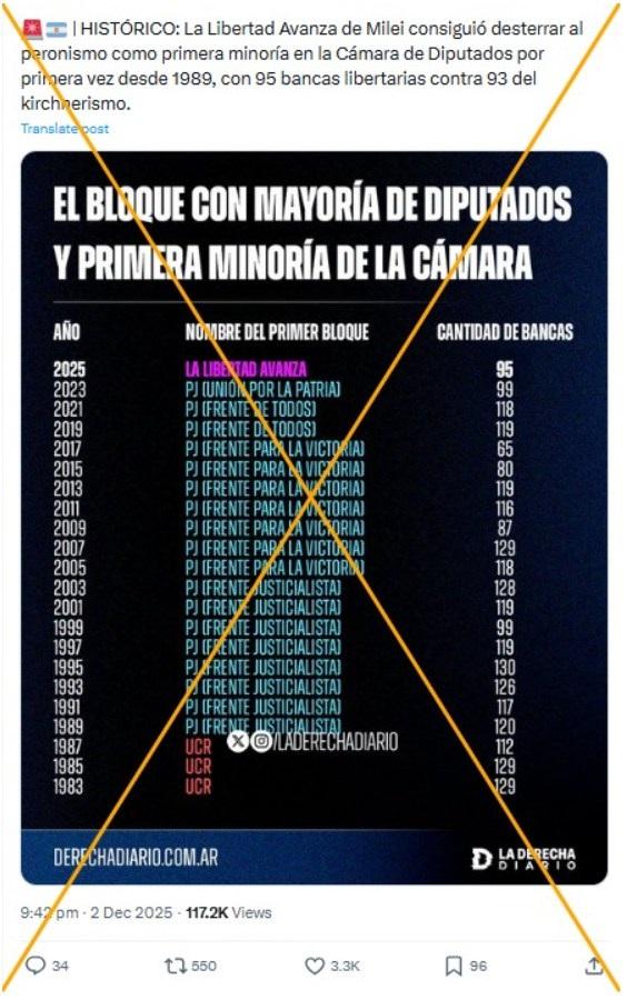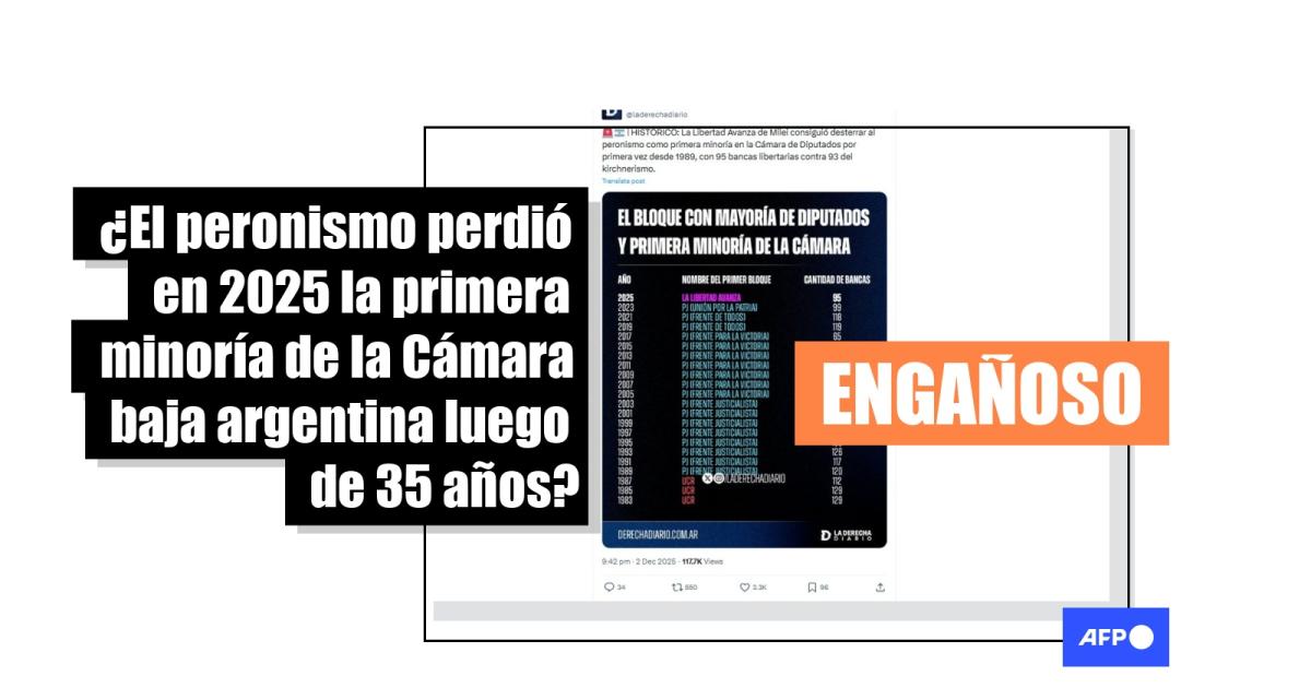 Con 95 bancas, el bloque del presidente argentino, Javier Milei, se consolidó como primera minoría en Diputados, luego de los últimos cambios en la composición parlamentaria antes de la jura del 3 de diciembre de 2025. Desde entonces, más de 4.000 usuarios en redes sociales aseguran que el oficialismo “consiguió desterrar” al peronismo de ese lugar por primera vez desde 1989. Sin embargo, expertos consultados por AFP confirmaron que esto ya ocurrió en 1999 y 2017.