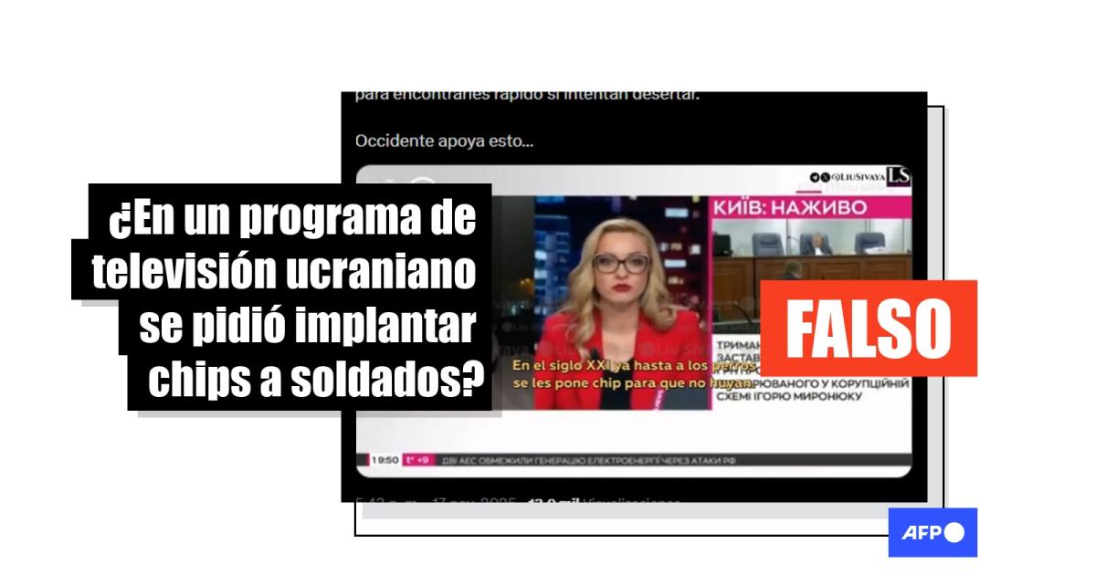En octubre de 2025, las autoridades ucranianas señalaron un aumento de las deserciones y crecientes dificultades para reclutar soldados desde febrero de 2022, cuando comenzó la invasión rusa en Ucrania. En ese contexto, una supuesta entrevista en una televisión ucraniana, en la que un hombre sugiere implantar microchips en los soldados para combatir las deserciones, ha sido compartida más de 1.000 veces en redes sociales desde noviembre. Sin embargo, la grabación fue creada con herramientas de inteligencia artificial, comprobó la AFP. Un portavoz de la cadena calificó el vídeo de “deepfake”.
