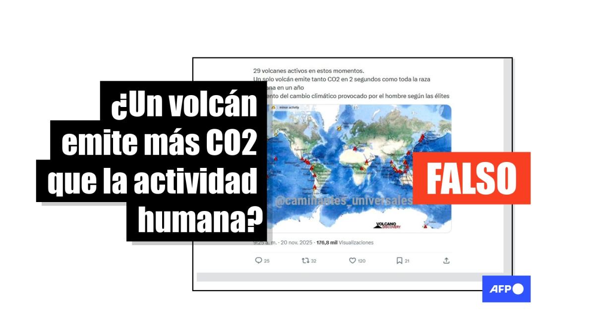 Los gases de efecto invernadero de origen humano son la principal fuente de emisiones de CO2 a nivel global. Sin embargo, desde mediados de noviembre de 2025, decenas de usuarios en redes sociales afirman que “un sólo volcán emite tanto CO2 en 2 segundos como toda la raza humana en un año” junto a un mapa que supone mostrar los volcanes activos en el planeta, con más de 190.000 visualizaciones. Pero especialistas consultados por la AFP explicaron que estas cifras son engañosas y científicamente incorrectas.