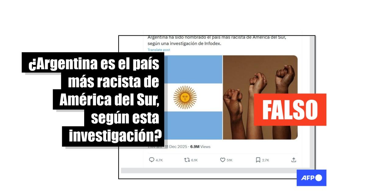 Un perfil en X llamado Infodex publicó el 7 de diciembre de 2025 un listado de países valorados supuestamente por su nivel de racismo. Desde entonces, en redes sociales se ha difundido que ese ranking mostró que Argentina es el país “más racista” de Sudamérica. Los mensajes se han compartido más de 7.000 veces. Pero en realidad la lista destaca los países “menos racistas” y cita fuentes que han posicionado a Argentina entre los de “mayor equidad racial”.