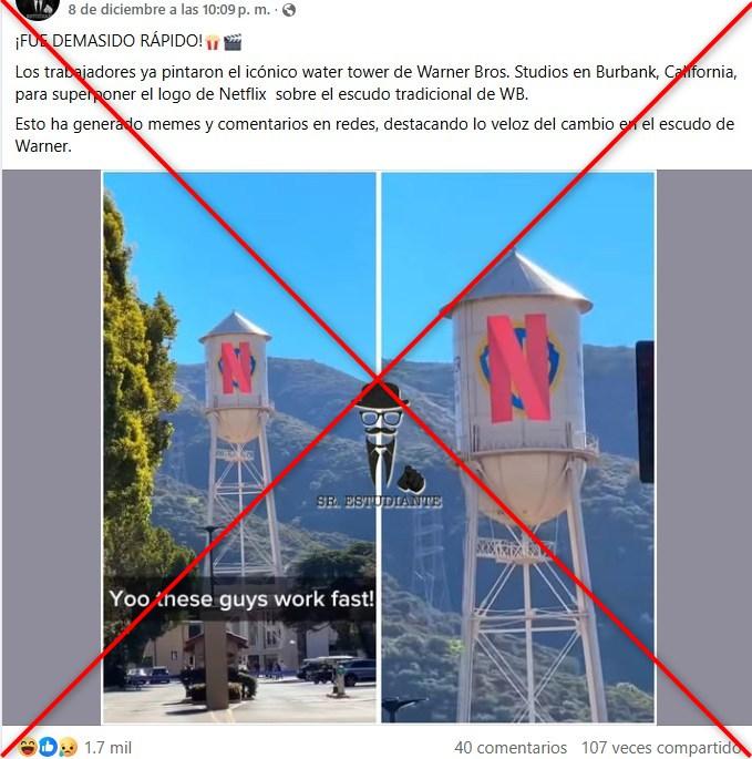 “Los trabajadores ya pintaron el icónico water tower de Warner Bros. Studios en Burbank, California, para superponer el logo de Netflix sobre el escudo tradicional de WB. Esto ha generado memes y comentarios en redes, destacando lo veloz del cambio en el escudo de Warner”, dice una publicación en Facebook.