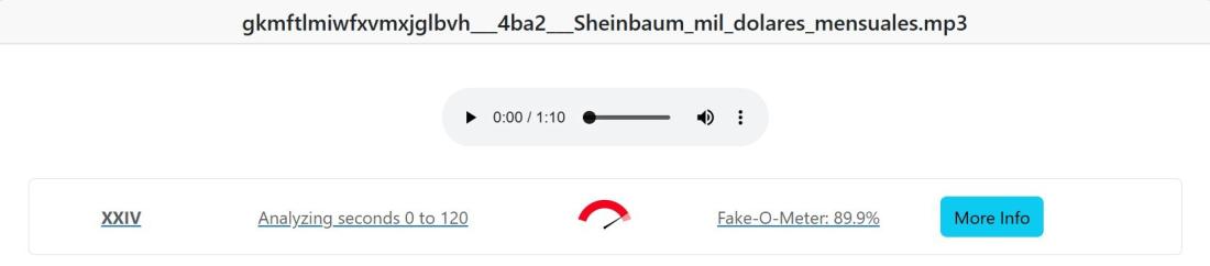 Un análisis del audio con la herramienta Deepfake Total arrojó un 89,9% de probabilidades de haber sido creado con IA.