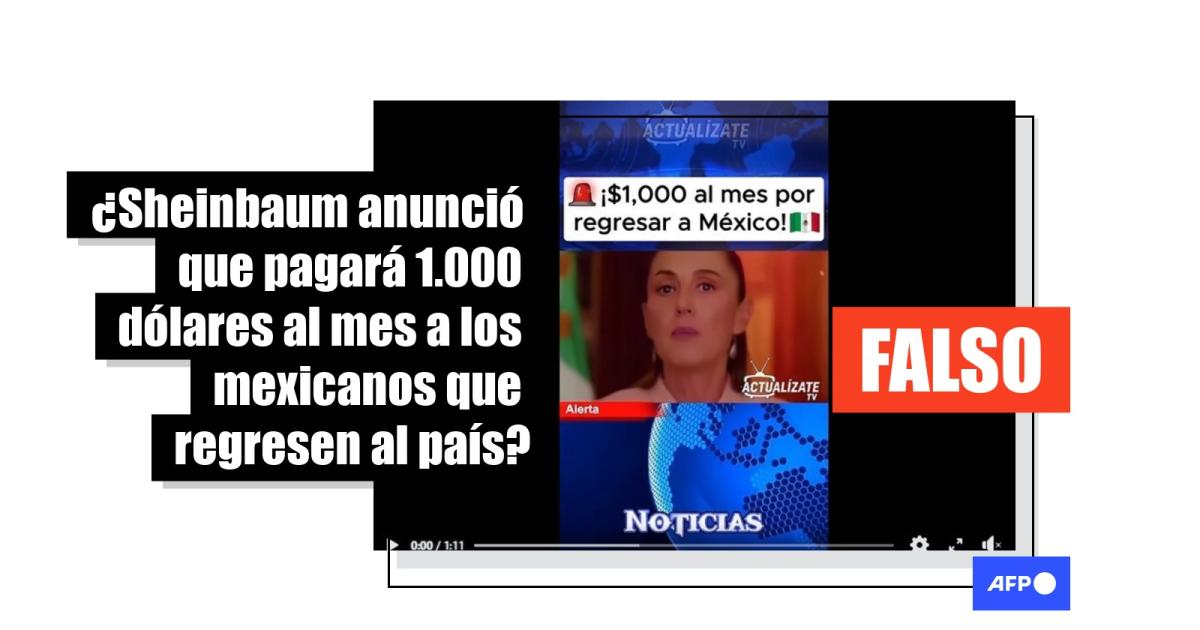 La presidenta mexicana, Claudia Sheinbaum, ha implementado en 2025 programas para apoyar a los migrantes mexicanos que regresan de Estados Unidos ante las políticas migratorias del gobierno de Donald Trump. En ese contexto, desde el 16 de diciembre, usuarios en redes sociales han difundido un video que muestra a la mandataria ofreciendo un pago de 1.000 dólares mensuales a los ciudadanos repatriados, hasta que encuentren empleo. Pero la secuencia, compartida más de 15.000 veces, fue creada con inteligencia artificial (IA) y no hay registros del supuesto beneficio.