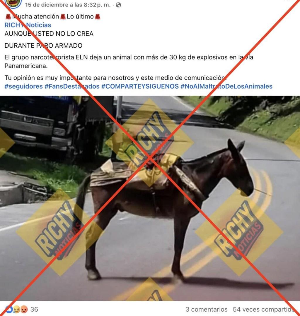 “DURANTE PARO ARMADO El grupo narcoterrorista ELN deja un animal con más de 30 kg de explosivos en la vía Panamericana”, se lee en un mensaje en Facebook, junto con la foto de un equino varado a la mitad de una vía.