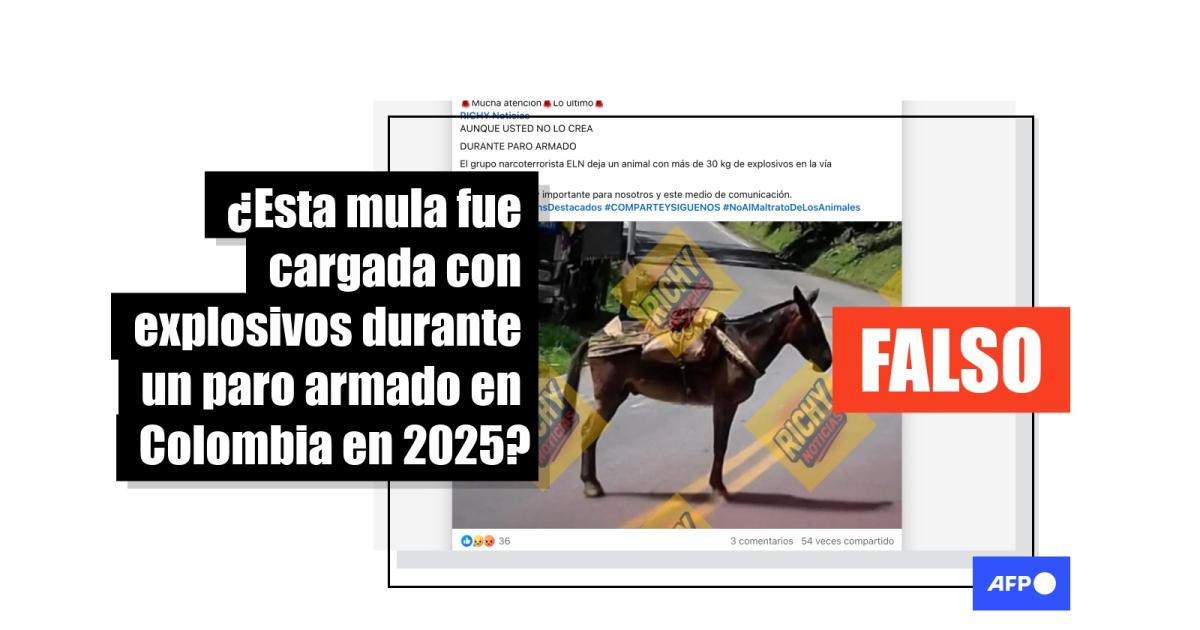 La guerrilla colombiana Ejército de Liberación Nacional (ELN) ordenó un “paro armado” a partir del 14 de diciembre de 2025, prohibiendo el tránsito a los civiles en sus zonas de influencia. En ese contexto, una foto de una mula en medio de una carretera, con una supuesta carga explosiva en el lomo, se difunde en redes sociales atribuida a la ofensiva de ese grupo. El contenido acumula 2.000 compartidos. Sin embargo, la imagen circula en internet por lo menos desde 2016, sin relación con un paro armado.