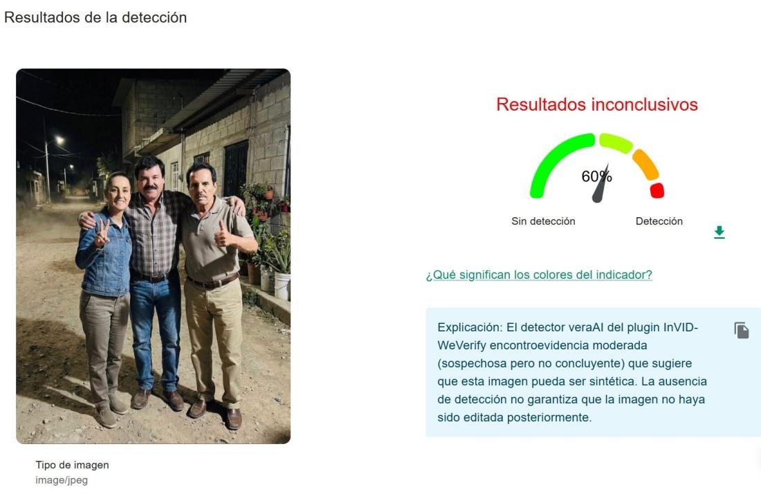 Un análisis de la imagen con VeraAI, una herramienta de InVID-WeVerify que detecta imágenes sintéticas, identificó un 60% de probabilidades de haberse generado con IA.