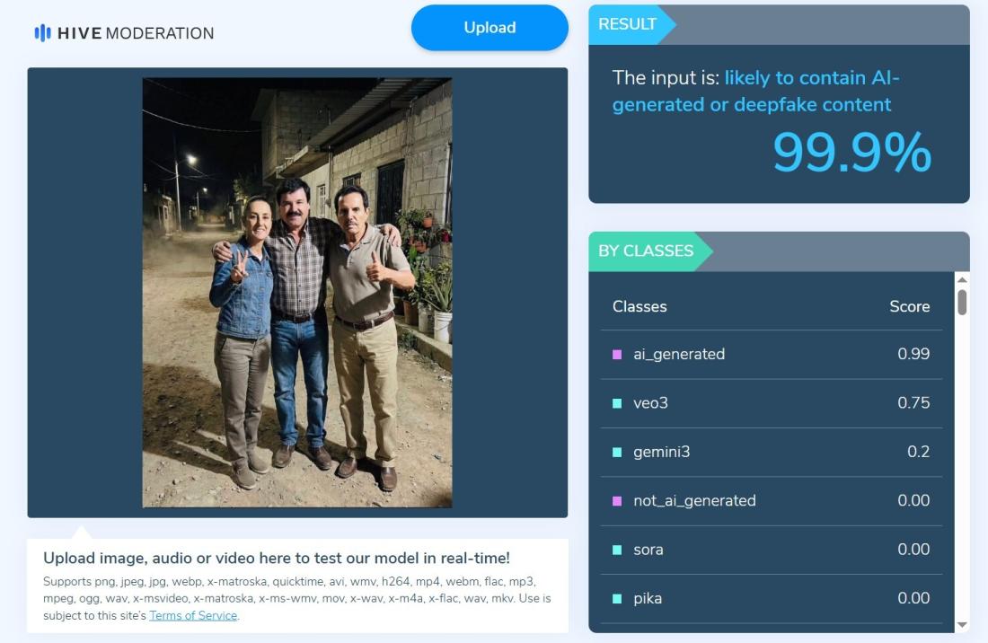 Otro análisis del material con la herramienta Hive Moderation, que permite detectar si un contenido fue generado digitalmente, arrojó un diagnóstico de 99,9%.