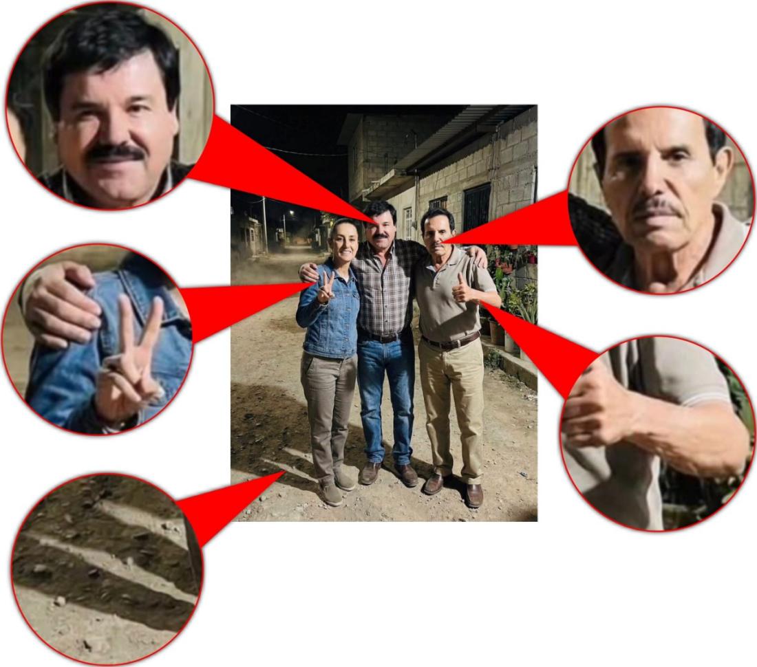 Pero la imagen que muestra a Sheinbaum al lado de estos dos capos se generó artificialmente.