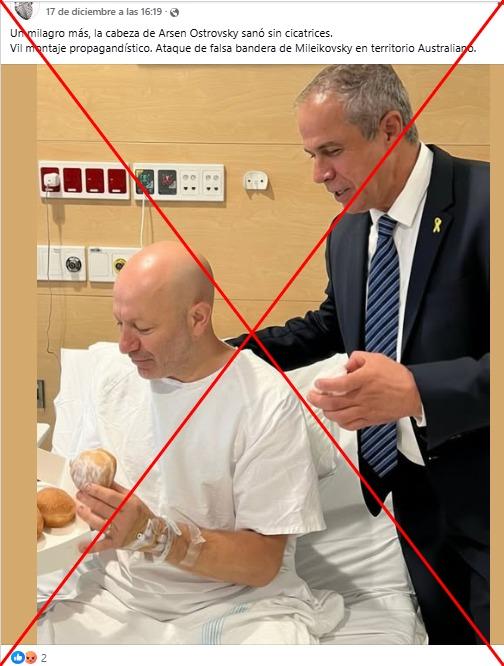 “Un milagro más, la cabeza de Arsen Ostrovsky sanó sin cicatrices. Vil montaje propagandístico. Ataque de falsa bandera de Mileikovsky en territorio Australiano”, dice un usuario en Facebook que comparte la imagen de un hombre en la camilla de un hospital con una bandeja de pasteles, y sin ninguna herida en la cabeza.