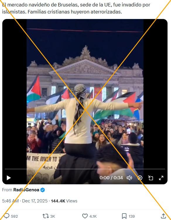 Los tradicionales mercados navideños han sufrido ataques en distintas ciudades de Europa en los últimos años. Pero es falso que un video difundido en redes sociales muestre a uno de estos lugares siendo “invadido por islamistas” en Bruselas, en diciembre de 2025. La secuencia, compartida más de 3.000 veces, corresponde a una marcha propalestina en la que no hubo registro de incidentes.