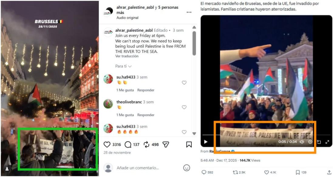 “El mercado navideño de Bruselas, sede de la UE, fue invadido por islamistas. Familias cristianas huyeron aterrorizadas”, asegura una publicación en X, junto a las imágenes de decenas de personas con banderas palestinas en una plaza donde hay luces navideñas de fondo.