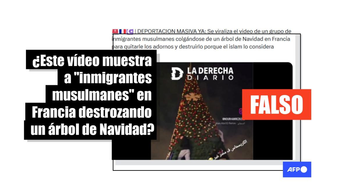 En los últimos años, los ataques masivos en los mercados navideños europeos han incrementado la necesidad de medidas de seguridad en los eventos públicos durante las fiestas. En este contexto, desde el 23 de diciembre de 2025, publicaciones compartidas más de 5.600 veces en redes sociales muestran un vídeo de personas escalando una gran estructura decorada, afirmando que se trataba de musulmanes vandalizando un árbol de Navidad en Francia. Sin embargo, la escena fue filmada cerca de El Cairo, Egipto, durante las celebraciones de Año Nuevo la madrugada del 1 de enero de 2025.