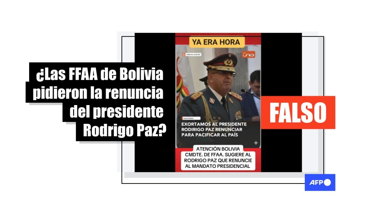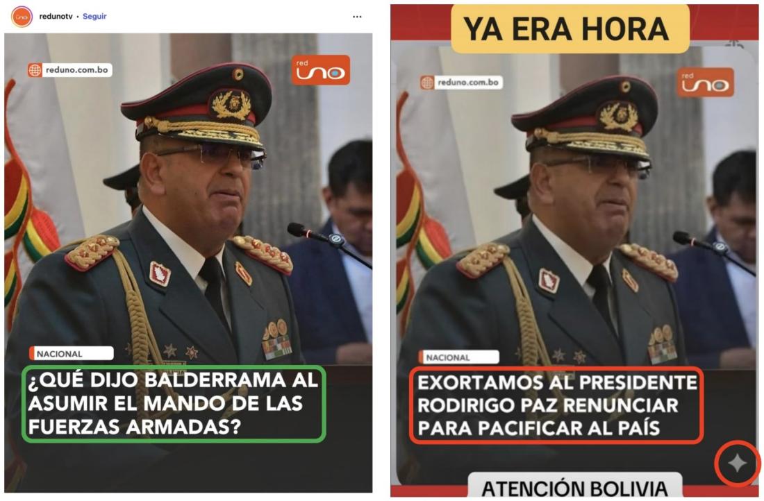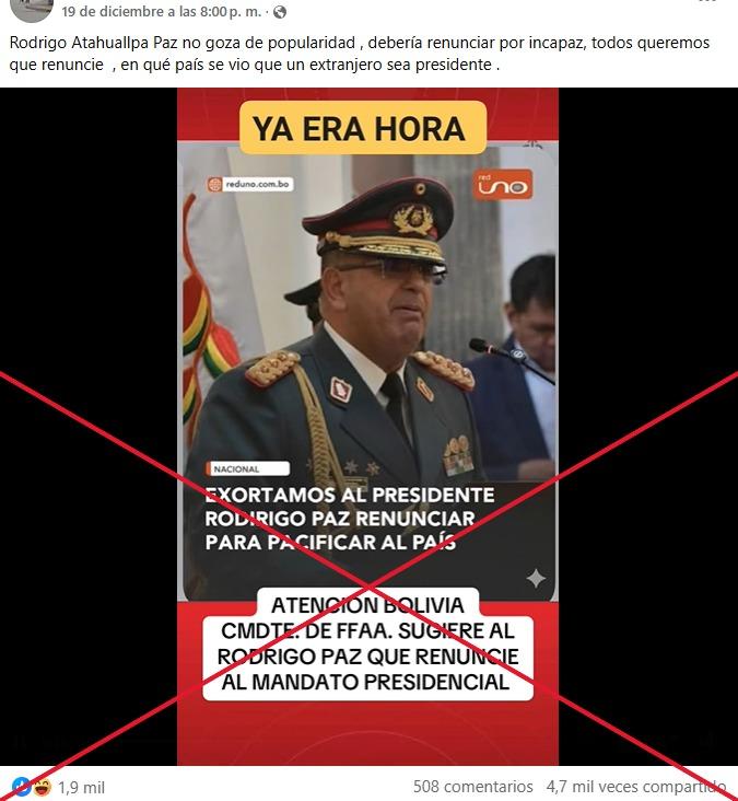 Otros usuarios en Facebook y TikTok acompañan el mismo audio con una supuesta placa del medio boliviano Red Uno, que incluye una foto del capitán general de las Fuerzas Armadas de Bolivia, Víctor Hugo Balderrama, y un titular que reza: “EXORTAMOS AL PRESIDENTE RODRIGO PAZ RENUNCIAR PARA PACIFICAR EL PAÍS”.
