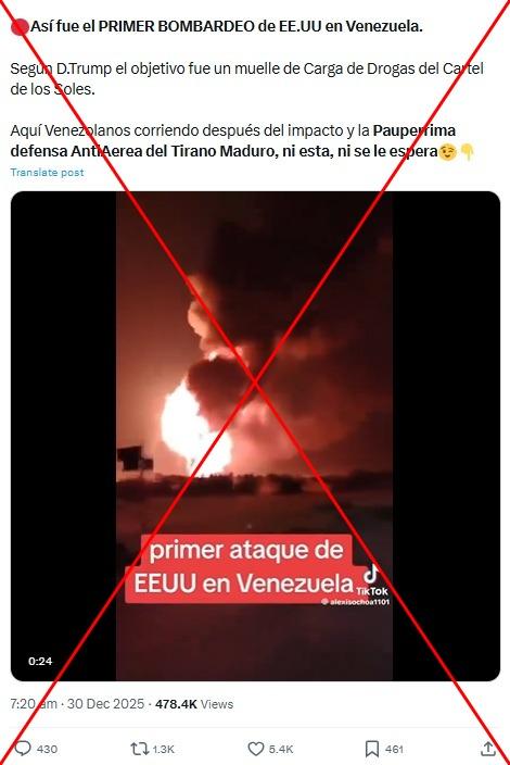El 29 de diciembre de 2025, el presidente estadounidense, Donald Trump, dijo que su país destruyó un muelle venezolano usado presuntamente para el narcotráfico, en lo que sería el primer ataque terrestre de su ofensiva contra los cárteles de drogas en América Latina. Desde entonces, circula en redes sociales un video de una explosión, que correspondería al “primer ataque de EEUU en Venezuela”, según más de 2.000 usuarios. Sin embargo, la secuencia muestra la explosión del 14 de noviembre en un polo industrial en el municipio argentino Ezeiza, en la provincia de Buenos Aires.