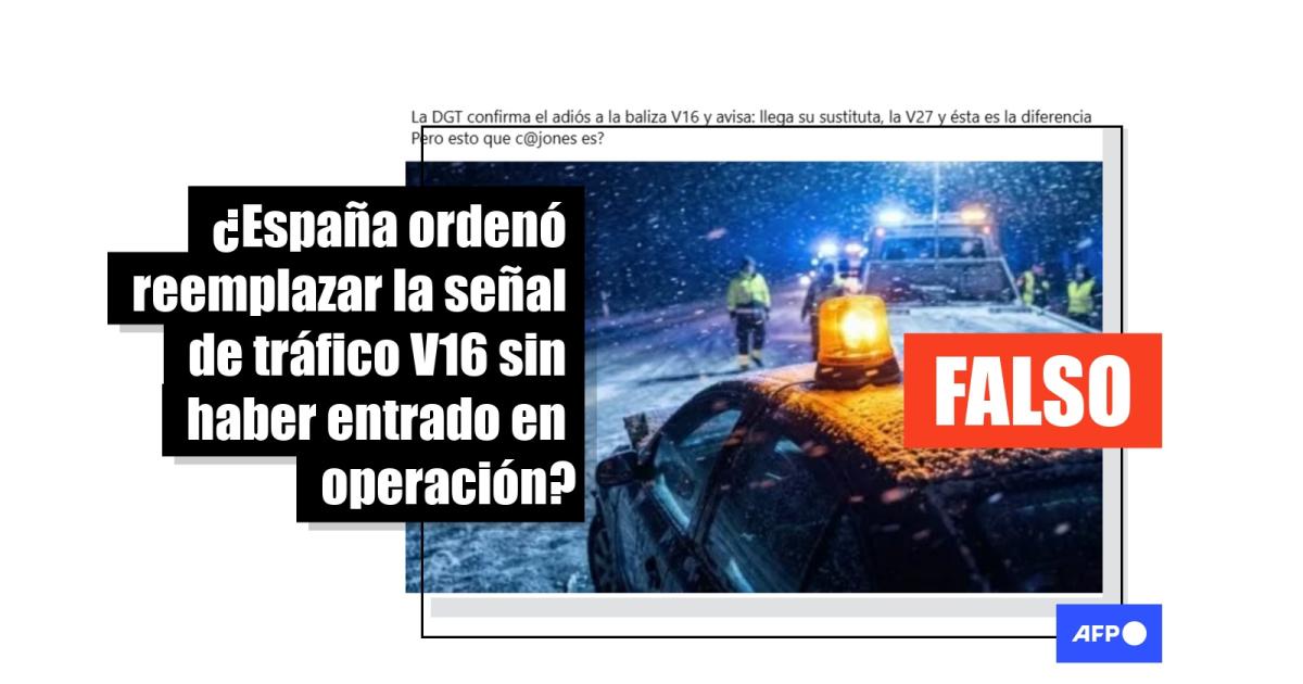 Desde el 1 de enero de 2026, los conductores en España deben usar una baliza luminosa en el techo de los vehículos en caso de accidentes o averías en carretera, llamada “V16”. Un mes antes, en redes sociales se difundió decenas de veces la afirmación de que el Gobierno decidió sustituir el dispositivo, sin entrar en vigencia, por otra señal, la “V27”, y usuarios se quejaron por la compra innecesaria de las luces V16. Pero es falso, esa baliza no se ha reemplazado y la V27 es de uso voluntario, informó la Dirección General de Tráfico (DGT) a AFP Factual.