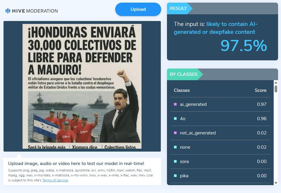 Hive Moderation, otra herramienta que también detecta contenido generado digitalmente, mostró un balance de 97,5%.