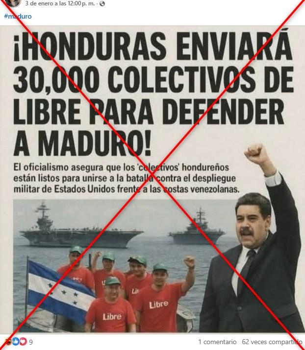 “¡Honduras enviará 30,000 colectivos de Libre para defender a Maduro!”, señala el titular de la imagen difundida en Facebook (1, 2), X, Instagram y TikTok.