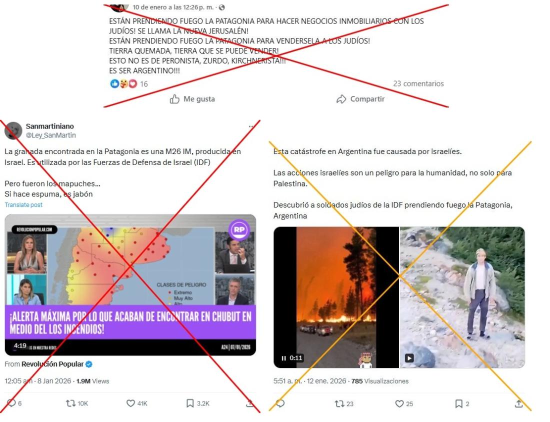 Más de 15.000 hectáreas de la Patagonia argentina han sido afectadas por los incendios iniciados el 5 de enero de 2026. Desde entonces, miles de usuarios en redes sociales han atribuido la responsabilidad a israelíes, con presuntas pruebas como el uso de una granada de origen israelí o un video de un joven encendiendo un fuego. Algunas entradas refieren a una teoría conspirativa conocida como “Plan Andinia”, que no tiene fundamento, confirmó un experto a la AFP. Al momento de esta publicación, el fiscal Carlos Díaz Mayer confirmó que el origen de los incendios sigue bajo investigación.