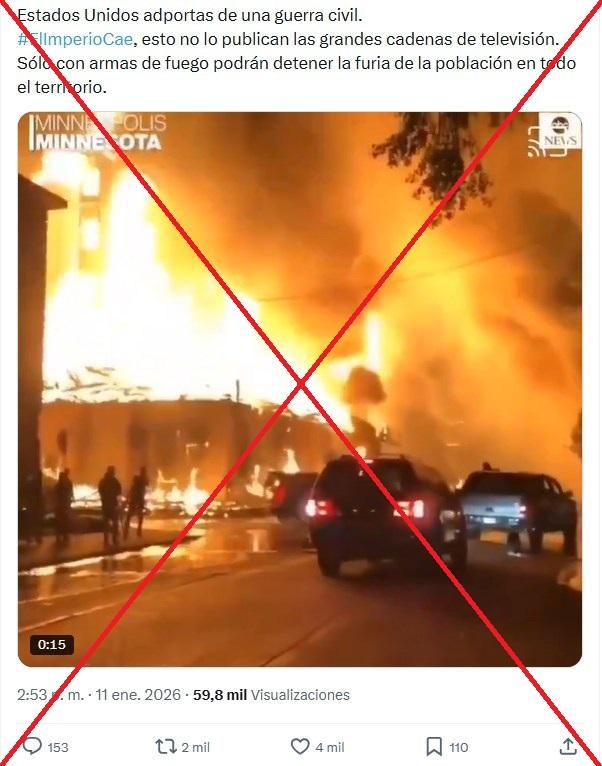 Después de que un agente de inmigración estadounidense disparó mortalmente a una mujer en Mineápolis, Minnesota, el 7 de enero de 2026, miles de manifestantes han salido a las calles de la ciudad coreando el nombre de la víctima. Desde entonces, usuarios en redes sociales han compartido más de 3.000 veces un video que muestra el incendio de un edificio, con la afirmación de que se trata de esas protestas. Pero la secuencia corresponde a las concentraciones tras la muerte de George Floyd a manos de la policía en 2020.