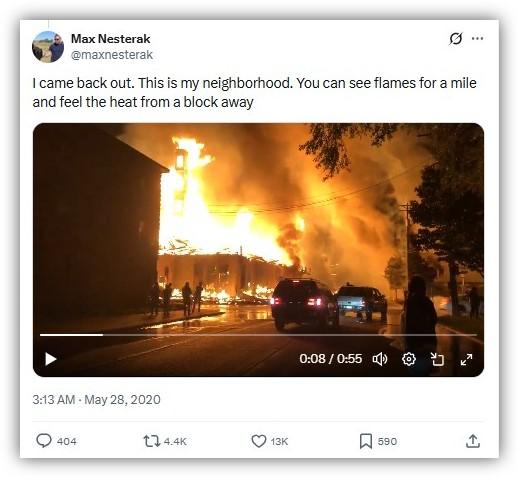 Nesterak la publicó como parte de un hilo que describe escenas sobre el terreno en la ciudad entre el 27 de mayo de 2020 y la madrugada del 28 de mayo de 2020, tras el asesinato de Floyd, un hombre negro, por parte de un oficial de policía blanco ese año.